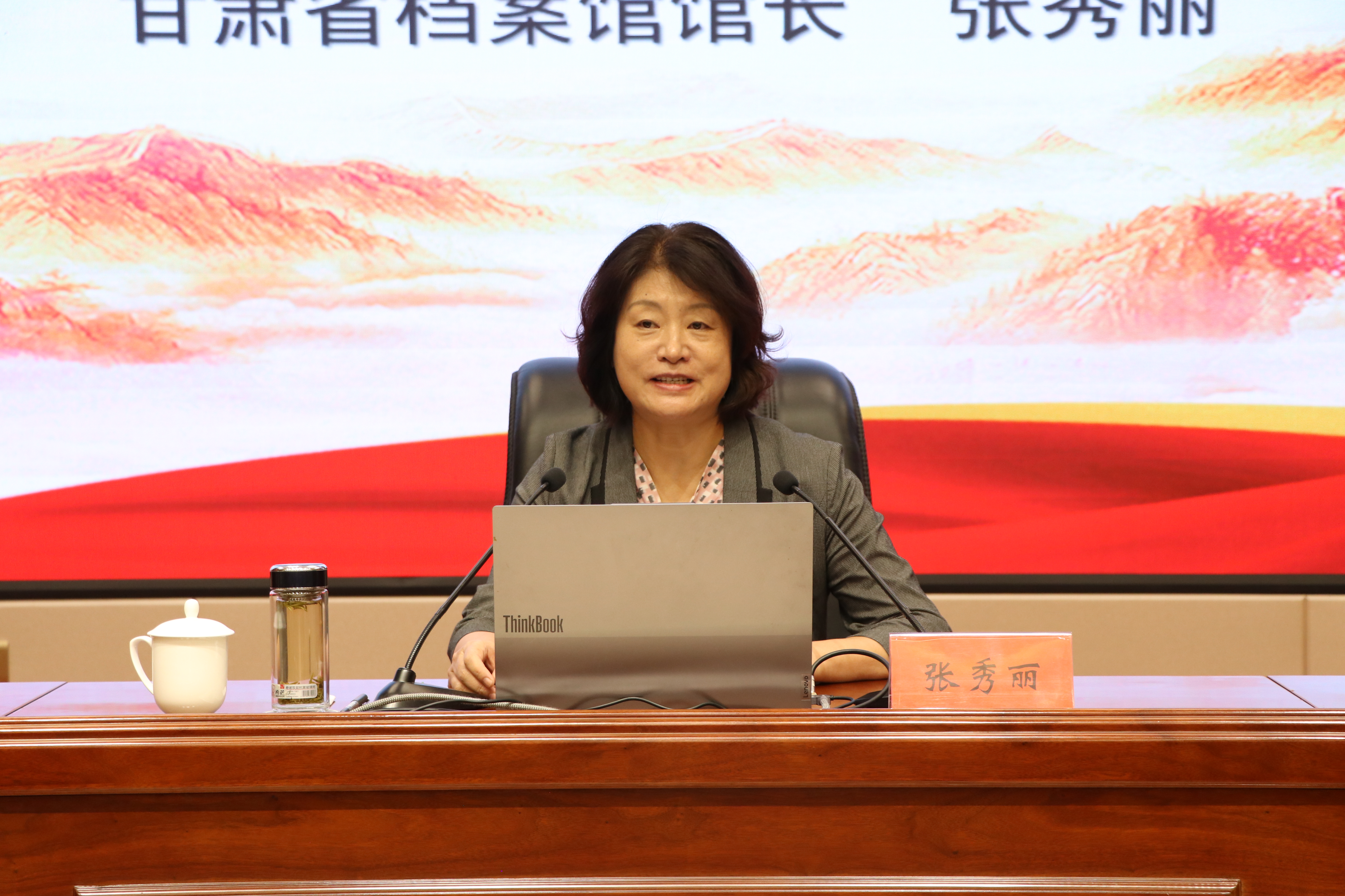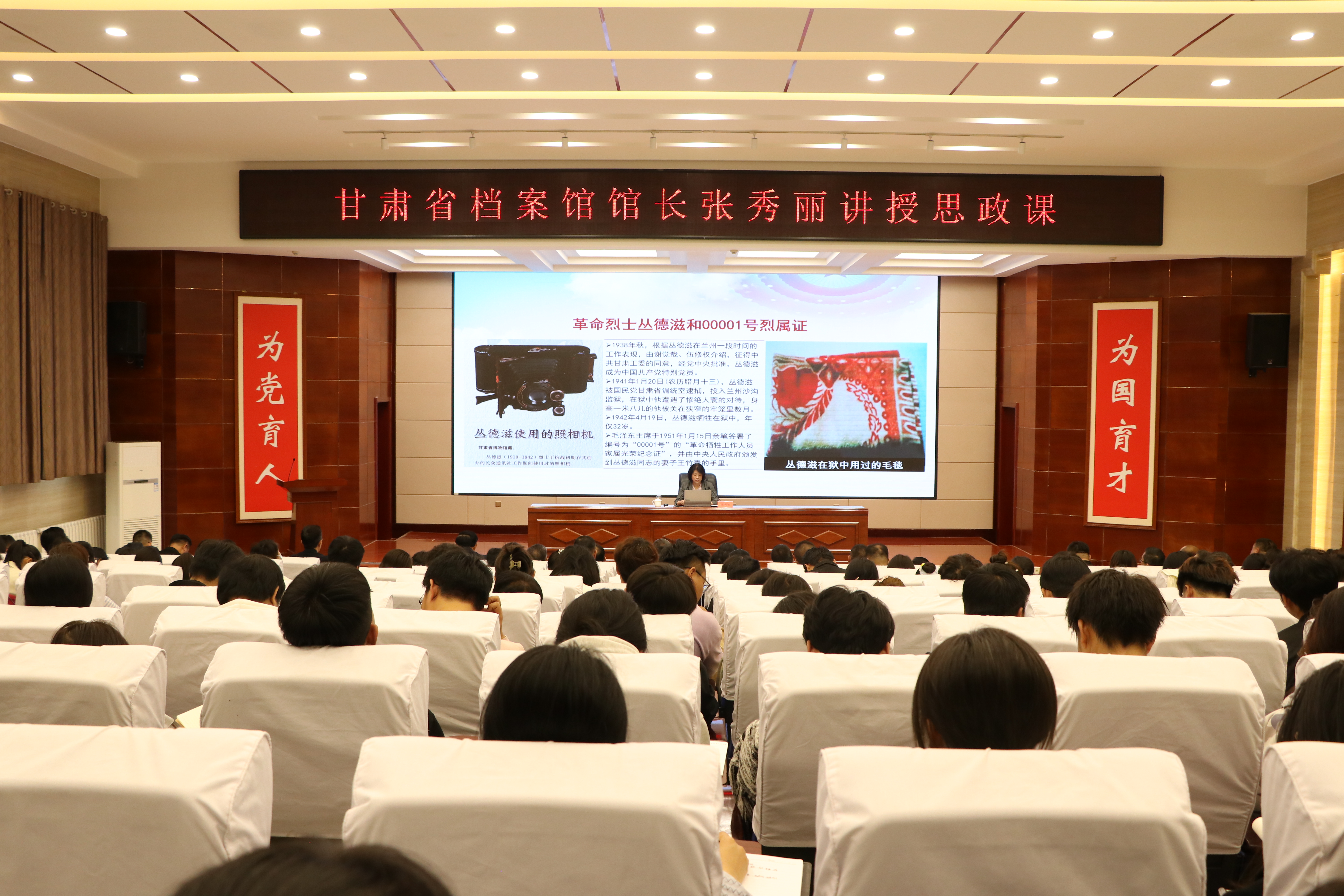 張秀麗結(jié)合自身從事檔案管理和文化研究的豐富經(jīng)驗(yàn),從檔案“存史、資政、育人”根本任務(wù)出發(fā),通過(guò)大量珍貴檔案文獻(xiàn)和歷史案例,系統(tǒng)闡述了檔案在記錄民族苦難輝煌、服務(wù)當(dāng)代治國(guó)理政、培育時(shí)代新人中的重要作用。報(bào)告中,她以館藏漢代簡(jiǎn)牘、革命烈士叢德滋00001號(hào)烈屬證、民勤治沙檔案、甘肅地震檔案等一批具有歷史代表性和地域特色的檔案為載體,帶領(lǐng)師生穿越時(shí)空,感受中華民族生生不息的精神力量,深刻解讀“勿忘昨天的苦難輝煌,無(wú)愧今天的使命擔(dān)當(dāng),不負(fù)明天的偉大夢(mèng)想”的時(shí)代內(nèi)涵。